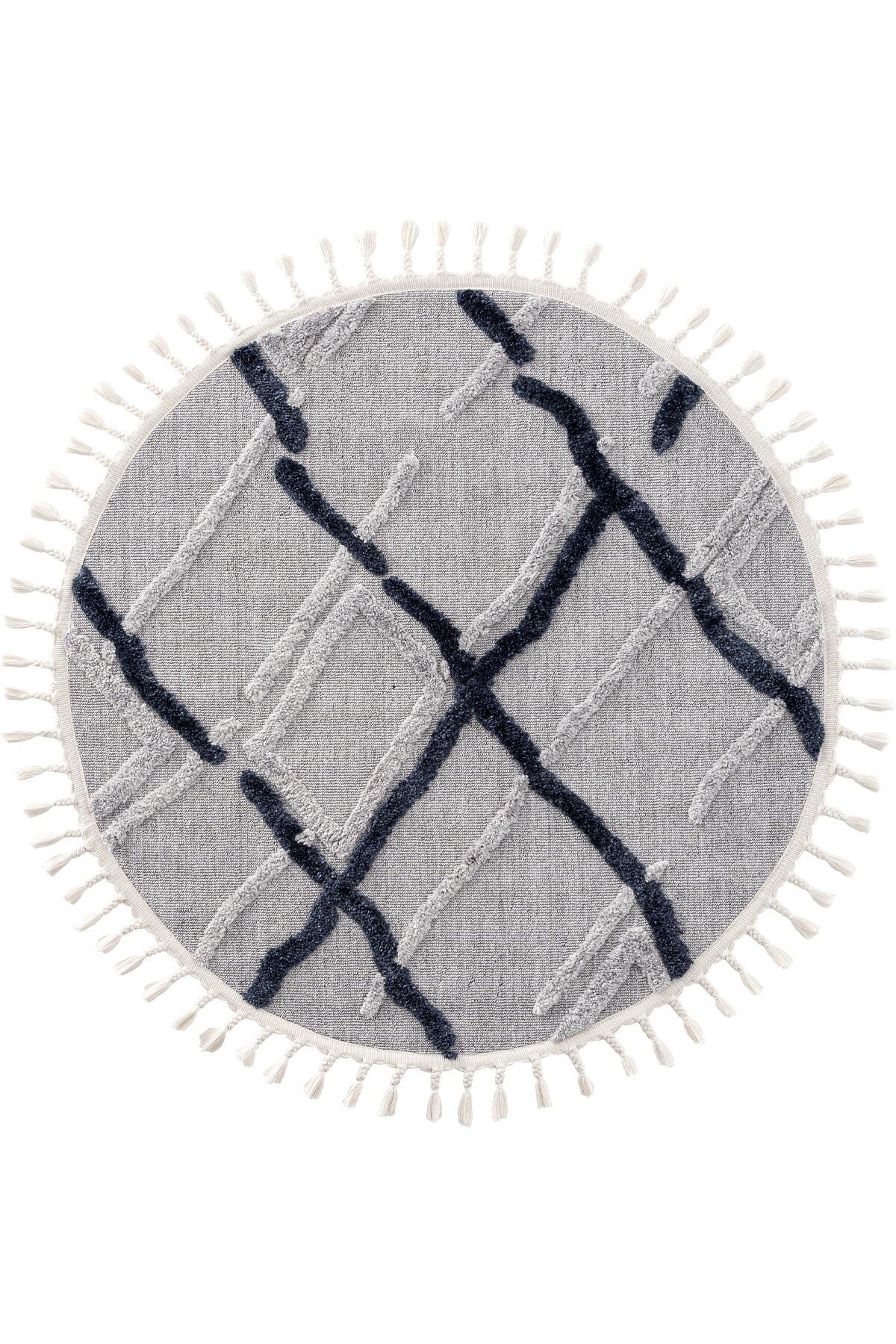 Yuvarlak Yumuşak Dokulu Etnik Örgü Desenlere Sahip Modern Gri Lacivert İskandinav Halı Trz 03